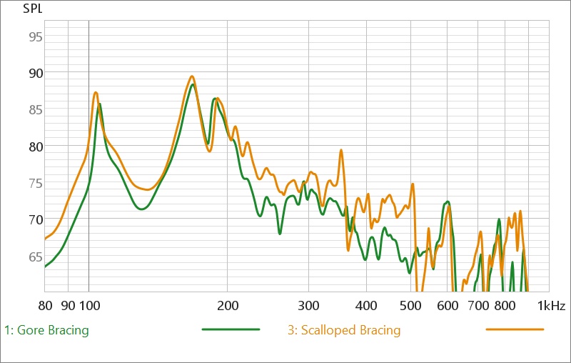 Spectral analyses confirm the observations of the players who have helped me evaluate the guitars. The scalloped-braced guitar produces peaks at 353 and 505 hz that aren’t evident with the Gore-type bracing.